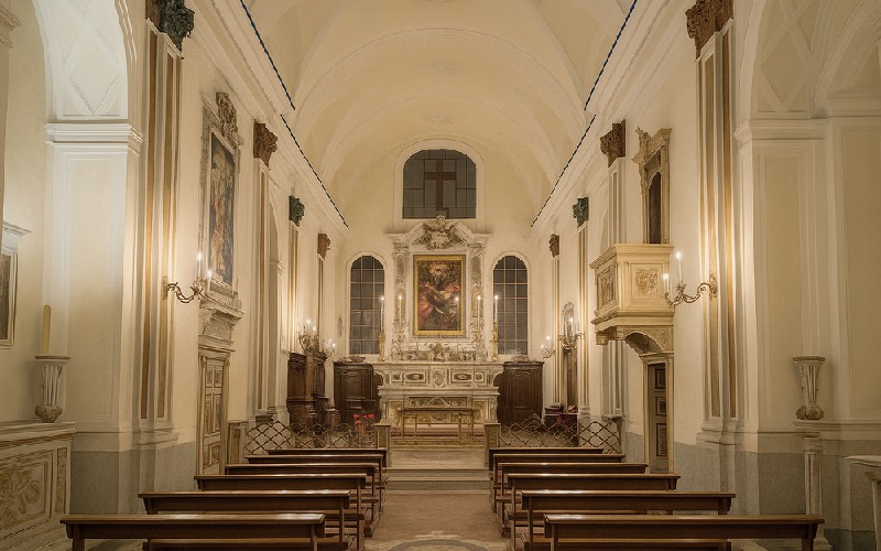 Nel tessuto storico tra via Toledo e i Quartieri Spagnoli si colloca l’Oratorio della Reale Compagnia ed Arciconfraternita dei Bianchi dello Spirito Santo, fondato nel 1555 e tra le istituzioni confraternali più antiche di Napoli. Luogo in cui arte, fede e potere si intrecciarono nei secoli, accolse tra i suoi membri papa Benedetto XIV e Ferdinando IV di Borbone. L’interno custodisce altari in marmi policromi, dipinti di Girolamo Imparato e Pietro Bardellino e un vasto affresco di Belisario Corenzio. Fulcro del complesso è la “Terra Santa”, articolata in due ambienti scenograficamente collegati da rampe monumentali: la prima a doppio rampante con arcate che evocano i cortili nobiliari settecenteschi, la seconda a andamento curvilineo, tipica soluzione di molte chiese napoletane del XVIII secolo. Le scale, insieme al pavimento maiolicato coevo, configurano un unicum architettonico di rara originalità. Completa il patrimonio la collezione di argenti confraternali, oggi custodita al Pio Monte della Misericordia. Un oratorio intimo e solenne, testimone di una stratificazione plurisecolare di devozione e cultura urbana.