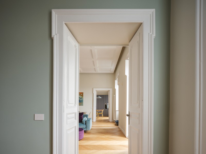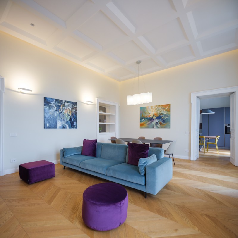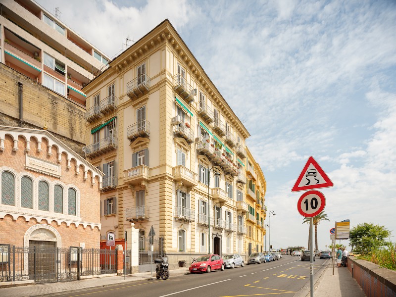 L'appartamento è ubicato in un edificio del 1901 realizzato da Enrico Alvino, una delle principali figure del panorama ottocentesco napoletano. L’edificio si affaccia sul golfo di Napoli e nelle belle giornate è totalmente inondato di luce mediterranea. Il progetto, realizzato a quattro mani dagli architetti Giuseppe Albanese e Raoul Basile, ha cercato di rispettare al massimo la struttura esistente conservando molti degli elementi presenti nell'appartamento come gli infissi, le porte interne, le mostre e alcune plastiche minori. Durante i lavori è stata rimessa in luce una volta affrescata che era stata coperta con una scialbatura. Sono stati disegnati diversi elementi di arredo su misura per nascondere le macchine dell'aria condizionata (fan coil a pavimento).